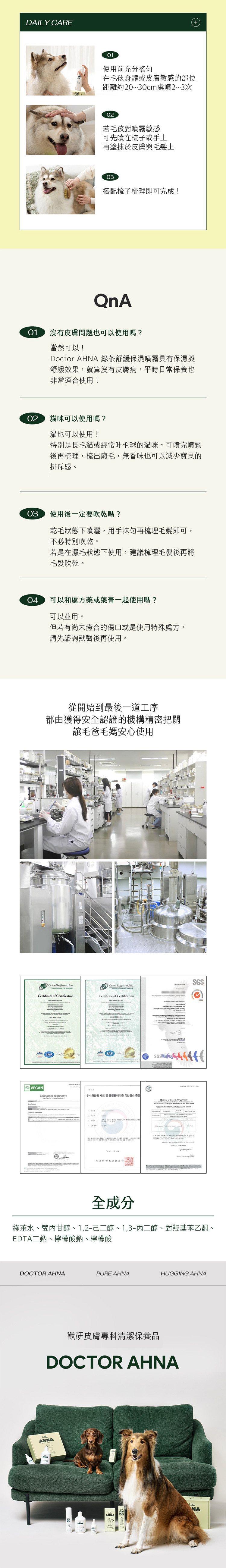 含93.4%韓國河東綠茶水,專利冷萃技術去除咖啡因,完整保留綠茶的保養成分,僅8種成分,適合敏感肌膚的狗狗做皮膚保濕護理