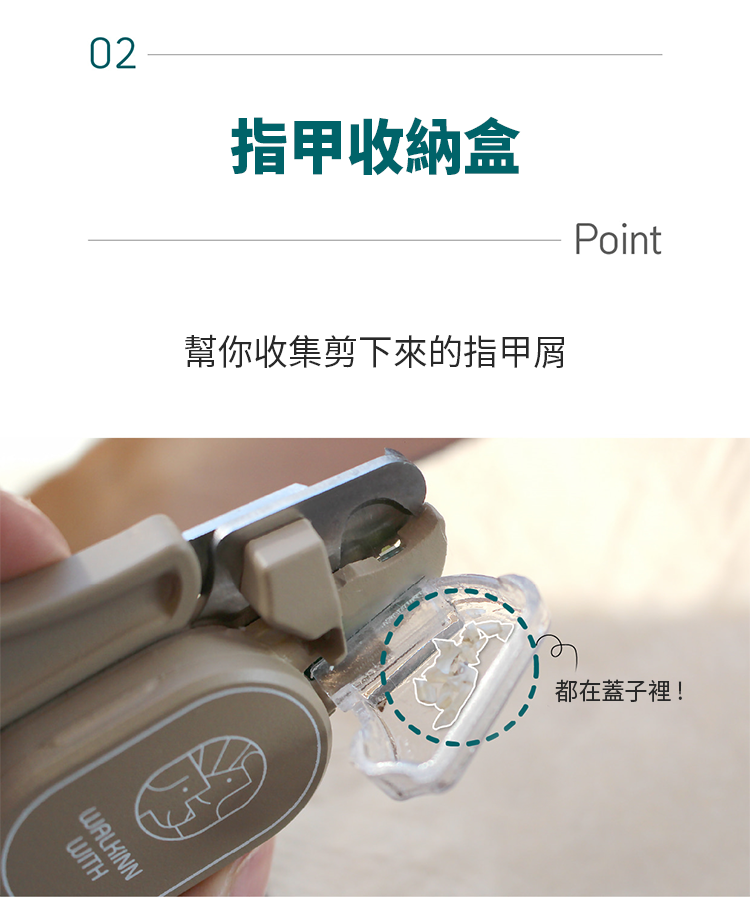 圓弧刀刃剪指甲俐落省力,附收納盒收集指甲屑,指甲屑不會散落滿地。"
