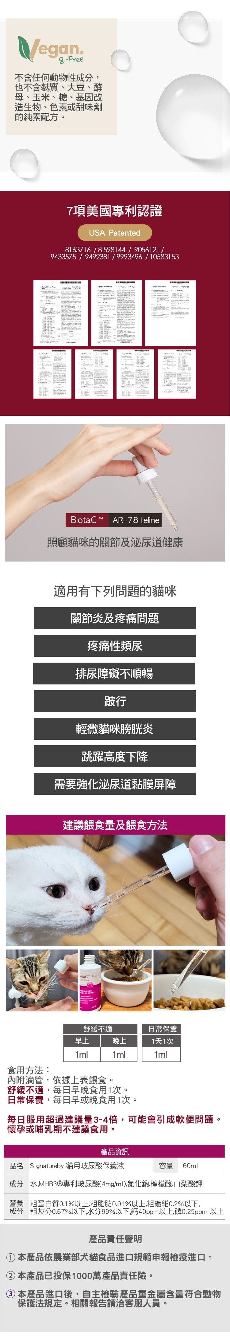 產地:美國專利生產玻尿酸,於韓國包裝完成。 適合對象:3個月以上貓(狗狗請購買狗用專用玻尿酸保養液) 有效年限:2年 最短出貨效期:2027/3/5 食用方式:依建議餵食量搭配主食餵食,舒緩疼痛不適,早晚各一次,日常關節保養,每日一次 注意事項:服用過量,因為玻尿酸吸水特性,有可能會引起軟便問題。孕期中或哺乳期間不適合服用。 本產品使用100ml的容器,開封後內容物約佔6成,並未裝滿整瓶。